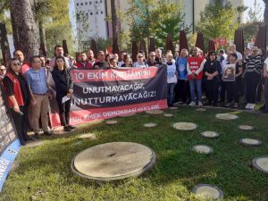 İzmir Emek ve Demokrasi Güçleri, 10 Ekim Ankara Katliamı’nın 9’uncu yılında 10 Ekim Barış Anıtı önünde toplanarak katliamda yaşamını yitirenleri andı. Katılımcılar, “10 Ekim’i unutma unutturma”, “Katil IŞİD işbirlikçi AKP”, ” Kurtuluş yok tek başına ya hep beraber ya hiç birimiz”, “Katil ABD Ortadoğu’dan defol”, ” Yaşasın halkların kardeşliği”, “Faşizme ölüm halka hürriyet”, “Katillerden hesabı …