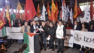 İzmir Barosu’nun çağrısıyla Emek ve Demokrasi Güçleri, İsrail’in Filistin’e yönelik saldırılarını protesto etmek için yürüyüş düzenledi. İzmir Barosu binası önünde bir araya gelen avukatlar, çağdaş Hukukçular Derneği üyeleri TMMOB, çeşitli kitle örgütü ve siyasi parti temsilcileri yürüyüşe geçerek Kıbrıs Şehitleri Caddesi üzerinden toplanma yeri Türkan Saylan Kültür Merkezi önüne geldiler. Yürüyüş boyunca ve açıklamalar sırasında …