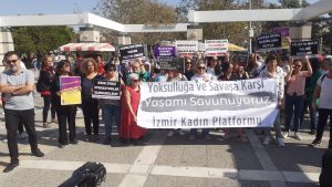 İzmir Kadın Platformu Türkan Saylan Kültür Merkezi önünde basın açıklaması yaptı. Açıklama sırasında kadınlar “Filistin halkı yalnız değildir”, “Savaşa değil kadınlara bütçe”, “Kahrolsun İsrail Yaşasın Filistin direnişi”, “Sermayeye değil kadına bütçe”, “Sınır ötesi operasyonlar durdurulsun”, ” Ortadoğu’da emperyalist müdahaleler son bulsun”, “kahrolsun ABD emperyalizmi Kahrolsun israil” sloganlarını attı. Okunan açıklama şöyle: “KADINLAR SAVAŞ DEĞİL EŞİT …