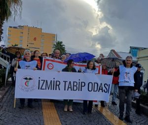 İzmir Emek ve Demokrasi Güçleri, Türk Tabipleri Birliği (TTB) Merkez Konseyi üyelerinin mahkeme kararıyla görevden alınmasını protesto etmek için basın açıklaması düzenledi. İzmir Tabip Odası önünde bir araya gelen emek ve demokrasi güçleri , “TTB onurdur onuruna sahip çık” “Hak, hukuk, adalet”, “TTB susmadı, susmayacak” , “Susma sustukça sıra san gelecek”, Faşizme karşı omuz omuza”, …