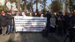İzmir’de hak örgütleri temsilcileri İnsan hakları Evrensel Bildirgesi’nin kabul edilişinin 75.yılında 10 Ekim Anıtı’nda “İnsan Hakları Evrensel Bildirgesi’nin 75.Yılında Ekonomik Kriz ve Yoksulluğa Karşı Ekonomik ve Sosyal Haklarımızı, Savaşa Karşı Barış Hakkımızı, Deprem, Salgın vb. Olağanüstü hallerde Toplumsal Dayanışmayı, Baskılara Karşı İnsan Hakları Değerlerini ve Demokrasiyi Savunuyoruz!” pankartı arkasında toplanarak basına ve kamuoyuna açıklama yaptı. …