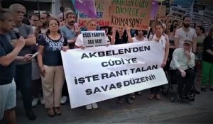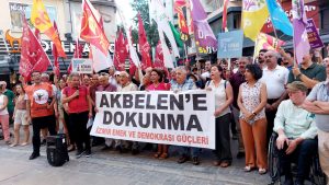 İzmir Emek ve Demokrasi Güçleri Türkan Saylan Kültür Merkezi önünde “Akbelenden Cudiye işte Rant,Talan Savaş Düzeni” pankartı açarak basın açıklaması gerçekleştirdi. Açıklayı Kesk Dönem Sözcüsü, Büro Emekçileri Sendikası (BES) İzmir Şube Başkanı Mustafa Güven okudu. Açıklama şöyle; “CUDİ YANIYOR AKBELEN AĞLIYOR Akbelen’de ağaç katliamını engellemeye çabalayan halkın üzerine polisi askeri, sürüyorlar. Yaşlı genç demeden zulmediyorlar. …