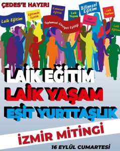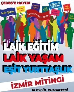 16 Eylül Saat 16.30 da Gündoğdu Meydanında denize bakan heykelin sol yanındayız. “Laik Eğitim, Laik Yaşam, Eşit Yurttaşlık Mitingi”ne katılmaya, çevremizi katmaya ve geleceğimize birlikte sahip çıkmaya davet ediyoruz