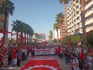 Devrimci İşçi Sendikaları Konfederasyonu (DİSK) İzmir’de; 7 Eylülde Hatay’da Başkanlar Kurulu’nu aldığı karar gereğince ‘kıdem tazminatı’, ‘gelirde ve vergide adalet’, ‘Orta vadeli program’konularıyla ilgili kitlesel eylem yaptı. Disk Ege Bölge Tesilciliği’nin önderliğinde eski Sümerbank önünde toplanan binlerce işçi katıldı. DİSK Genel Başkanı Arzu Çerkezoğlu, DİSK Yönetim Kurulu ve DİSK Ege Bölge Temsilcisi Memiş Sarı ve İzmir …