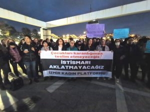 İzmir Kadın Platformu, ” Çocukları karanlığa teslim etmeyeceğiz. istismarı aklatmayacağız” pankartı açarak, Konak Vapur iskelesi önünde 6 yaşındaki bir çocuğun sistematik istismarından hareketle çocuklara yönelik tecavüz ve cinsel istismarı protesto için basın açıklaması yaptı. Açıklama sırasında “çocuk istismarları politiktir”, “çocuk çocuktur, istismar suçtur”, “sözleşmeler bizimdir, vazgeçmiyoruz”, “karanlığa teslim olmayacağız”, “susmuyoruz, korkmuyoruz, itaat etmiyoruz” sloganları atıldı. …