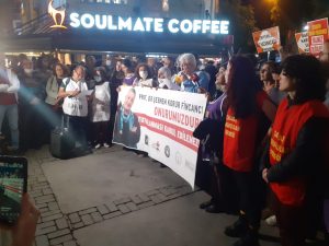 Türk Tabipleri Birliği Merkez Konseyi Başkanı ve Türkiye İnsan hakları Vakfı Yönetim Kurulu üyesi Prof.Dr. Şebnem Korur Fincancı’nın tutuklanması Türkan Saylan Kültür Merkezi önünde, Türkiye İnsan Hakları vakfı İzmir temsilciliği, İnsan Hakları Derneği İzmir Şubesi, Özgür Hukukçular Derneği İzmir Şubesi, Çağdaş Hukukçular Derneği İzmir Şubesi ve İmece Dostluk Dayanışma Derneği tarafından protesto edildi ve basın …