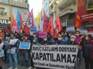İzmir Emek ve Demokrasi Güçleri, Suruç Katliamı davasının bir kişiye ceza verilerek kapatılıp unutturulmak istenmesine karşı sokağa çıktı; Suruç ve tüm katliamların gerçekten aydınlatılması için sokakta olmaya ve mücadeleye devam edeceklerini açıkladı. Türkan Saylan Kültür Merkezi önünde toplanan İzmir Emek ve Demokrasi Güçleri, “Suruç katliamı dosyası kapatılamaz” pankartı arkasında toplandı . Katılımcılar “Suruç’un davası …
