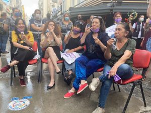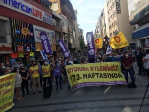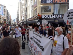 10 Haziran Perşembe günü İstanbul Sözleşmesinden Vazgeçmiyoruz İzmir Kampanya Grubu Alsancak Türkan Saylan Kültür Merkezi önünde yedinci nöbet eylemini gerçekleştirdi. Nöbet eylemi öncesinde katledilen kadınların adları okundu, katılımcılar “burada” ve “isyanımızdır” derken faillerin adları okundu “katildir” diye haykırdılar. Basından bir haberi aktardılar; R.T. Erdoğan’ın Beylerbeyi’nde bir dondurmacıya oturup dondurma yediğini ve dondurmacıda daha önceden oturmuş …