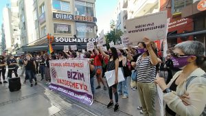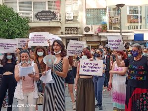 İstanbul Sözleşmesi’nden Vazgeçmiyoruz İzmir Kampanya Grubu altıncı nöbetini Alsancak’ta Türkan Saylan Kültür Merkezi önünde gerçekleştirdi. “İstanbul Sözleşmesi bizim vazgeçmiyoruz” pankartının açıldığı eylemde kadınlar “İstanbul Sözleşmesi Bizimdir, Vazgeçmiyoruz”, “Kadın cinayetleri politiktir “, “Musa Orhan tecavüzcüdür”, “Erkek-devlet şiddetine son” ve “Kadınlara değil mafyaya barikat” sloganlarını attı. Kadınlar yaptıkları açıklamayı sloganlar ve zılgıtlarla bitirdi. İstanbul Sözleşmesi’nden Vazgeçmiyoruz İzmir …
