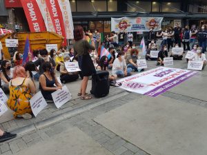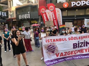 İzmir Kampanya Grubu “İstanbul Sözleşmesinden Vaz geçmiyoruz” talebiyle nöbet eylemini Alsancak Türkan Saylan Kültür merkezi önünde gerçekleştirdi. Saat 18.30 da başlayan nöbet eyleminde kampanya grubu adına yapılan konuşmalarda erkek egemen sistem içinde şiddet kullanan erkeğin devlet mekanizmalarınca korunduğu, cezasız kaldığı, bunun kadın cinayetlerinin devamına yol açtığı belirtildi. Her gün en az bir kadının, bazen birkaç …