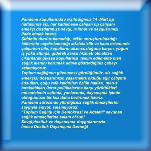 İzmir Sağlık Platformu, Cumhuriyet Meydanı deniz kıyısında 14 Mart Tıp Bayramı Haftası kapsamında, “Katledilen ve kaybettiğimiz sağlık çalışanlarının emek mücadelesi ,mücadelemize ışık tutmaya devam ediyor.” basın açıklaması yaptı ve denize kırmızı karanfiller bıraktı. Açıklamaya, İzmir Sağlık Platformu bileşenleri, İzmir Emek ve Demokrasi Güçleri Demokratik Kitle Örgütü temsilcileri ve HDP Milletvekili Murat Çepni de katıldı. Basın …