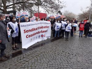 İzmir’de sağlık emekçileri baskılara, sürgünlere ve açığa almalara karşı sokağa çıktı. Sağlık emekçileri; Sendikal faaliyetlere karşı uygulanan baskılara,sürgünlere ve açığa alınmaya karşı aşağı bakmayacağız, direne direne kazanacağız.