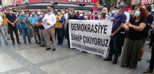 İzmir Emek ve Demokrasi Güçleri, Hakların Demokratik Partisi’ne (HDP) yönelik gözaltı ve operasyonları protesto etti. Alsancak Türkan Saylan Kültür Merkezi önünde yapılan basın açıklamasına demokrasi güçleri bileşenleri ve CHP İzmir Milletvekili Kamil Okyay Sındır da katıldı. Katılımcılar “Faşizme karşı omuz omuza”, “Yaşasın devrimci dayanışma”, “Gözaltılar baskılar bizi yıldıramaz”, “Direne direne kazanacağız”, “Kurtuluş yok tek başına …