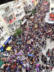 İzmir Kadın Platformunun çağrısıyla ÖSYM önünde binlerce kadın bir araya gelerek Alsancak Türkan Saylan Kültür Merkezi önüne yürüdü. Kadınlar, yürüyüşe mor renkli eldivenler, mor giysileri ile katıldı. Kadınlar kapitalizm ve faşizm tarafından önü açılan, kışkırtılan kadın cinayetlerine, tacize, tecavüze, çocuk istismarlarına, yoksulluğa, sömürüye, işten atılmalara, Suriye’de savaşa karşı haykırdılar. Yürüyüşe sendikalı oldukları işten atılan SF …