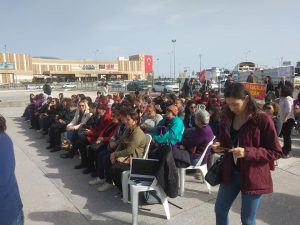 KHK eliyle bir gecede çalışma hakkından, işinden, ekmeğinden edilen kamu emekçileri Karşıyaka Çarşı girişinde 138. oturma eylemini yaptı. KHK’li kadın emekçiler, 8 Mart’a Emekçi kadınlar gününe gidilirken, 138.oturma eyleminde haklarını ve taleplerini haykırdılar.