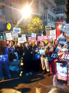 25 Kasım Kadına Yönelik Şiddete Karşı Uluslararası Mücadele Günü dolayısıyla İzmirli kadınlar, Alsancak’ta ÖSYM önünde toplanarak Türkan Saylan Kültür Merkezi’ne yürüdü. Kadınlar “Eşit özgür, güvenceli bir yaşamdan vazgeçmiyoruz” pankartı taşıdı. Yürüyüş boyunca kortejde sık sık “Nehirden denize özgür Filistin”, “Yaşasın kadın dayanışması”, “Katledilen kadınlar isyanımızdır” ve “Görünmeyen emeğin sesini yükselt”, “Susmuyoruz korkmuyoruz itaat etmiyoruz”, “ …