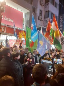 İzmir Emek ve Demokrasi Güçleri, Ortadoğu’da derinleşen savaş politikalarına, Rojava’da sürdüğü belirtilen sivil katliamlara ve emperyalist müdahalelere karşı Alsancak’ta sokağa çıktı. ÖSYM binası önünde toplanan kitle, Türkan Saylan Kültür Merkezi önüne yürümek istedi ancak yürüyüş polis tarafından engellendi. Yürüyüş izni verilmeyen kitle, polis ablukası altında basın açıklaması yapmak zorunda kaldı. Eylemde “Ortadoğu’da halkların kaderi emperyalizme …