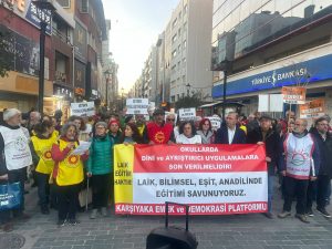 İzmir’in Karşıyaka ilçesinde Karşıyaka Emek ve Demokrasi Platformu, İZBAN istasyonu önünde toplanarak “Okullarda dini ve ayrıştırıcı uygulamalara son verilmelidir — Laik, bilimsel eşit anadilinde eğitim istiyoruz” pankartı açtı. Grup, Kemalpaşa Caddesi boyunca yürüyerek çarşı girişinde basın açıklaması yaptı. Yurttaşlar eylem boyunca “Çocuk işçiliğine hayır”, “Laik bilimsel eğitim istiyoruz”, “Cemaat ve tarikatlar kapatılsın”, “Çedes ve …