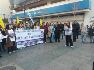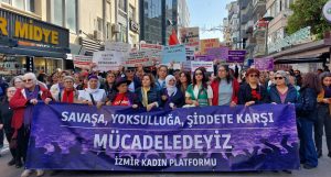 İzmir Kadın Platformu’nun çağrısıyla çok sayıda kadın, 8 Mart Dünya Emekçi Kadınlar Günü kapsamında “Savaşa yoksulluğa şiddete karşı mücadeledeyiz ” pankartı açarak, Alsancak’taki Türkan Saylan Kültür Merkezi önünde bir araya geldi. Kadınlar buradan cadde sonundaki Penguen Kitabevi’ne kadar sloganlar eşliğinde yürüdü. Yürüyüş boyunca “Ucuz işçi olmayacağız”, “Yaşasın 8 Mart yaşasın mücadelemiz”, “Kadın cinayetleri politiktir”, “Jin …
