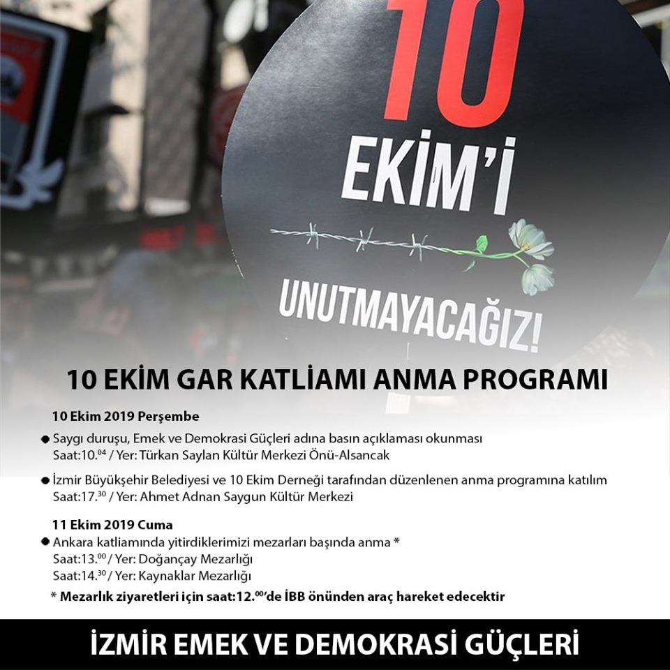 Aynı gün saat 17.30-21.30 arasında Adnan Saygun Kültür Merkezi’nde bir dizi etkinlik gerçekleştirilirken, 11 Ekim Cuma günü ise Ankara katliamında yaşamını yitirenler İzmir Emek ve Demokrasi Güçleri tarafından mezarları başında anılacak. Anmalar saat 13.00’te Doğançay Mezarlığı’nda, saat 14.30’da ise Buca Kaynaklar Mezarlığı’nda gerçekleşecek. Mezarlık anması için saat 12.00’de İzmir Büyükşehir Belediyesi önünden otobüs kaldırılacak.