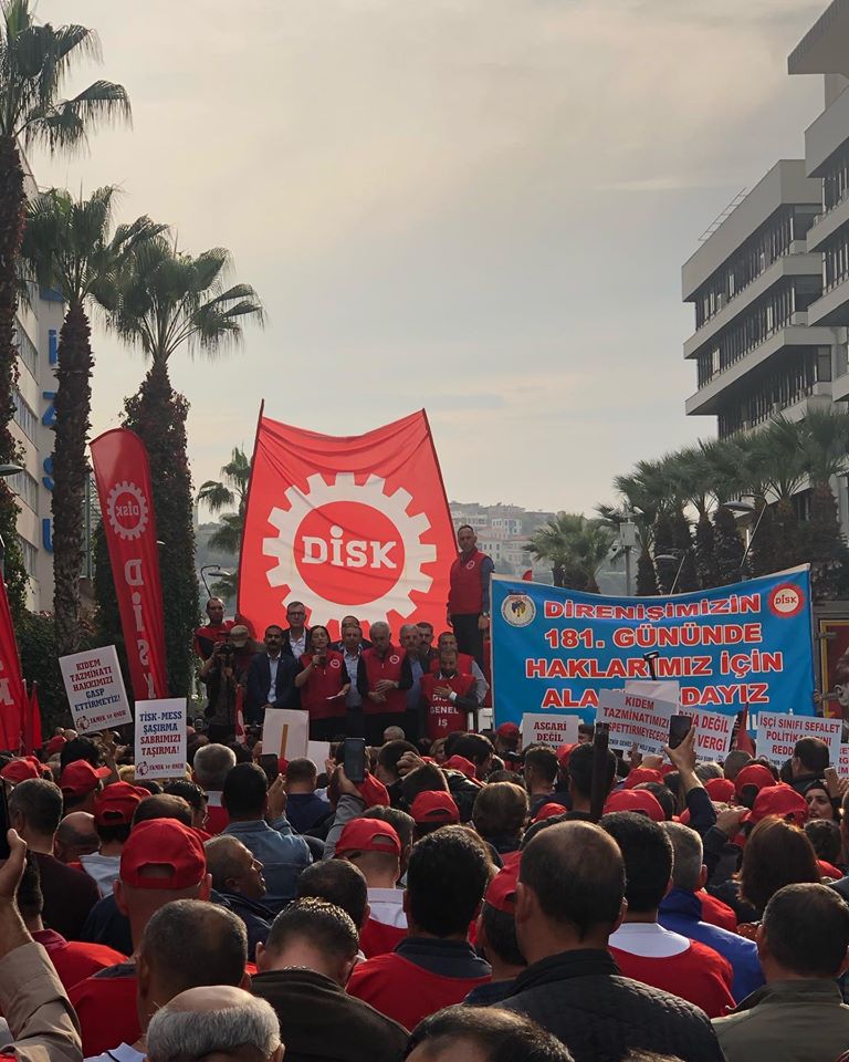 DİSK Ege Bölge Temsilcisi Memiş Sarı “Hep birlikte kapitalizme karşı bu mücadeleyi sürdüreceğiz. Genel merkez grev kararı alırsa bu grevi tüm işçiler olarak uygulayacağız” dedi.