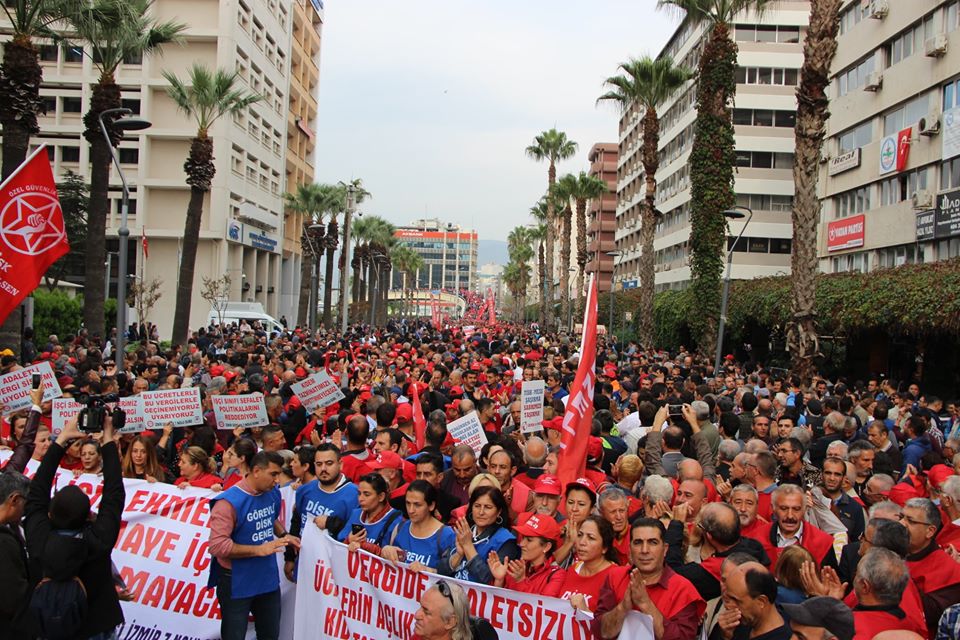 “Vergiyi tabana yayacağız diyorlar. Devletin topladığı verginin neredeyse tamamını işçiler ödüyor. İnsaf edin! Bu ülkede eğer bir vergi politikası konuşulacaksa vergiyi tabana değil tavana yayın. Az kazanandan az, çok kazanandan çok alın. Asgari ücret tümüyle vergi dışı bırakılsın. Genel tüketim maddelerindeki KDV sıfırlamalı. Vergi yoluyla daha da yoksullaştırmaya çalışanlara karşı vergi talebini daha da yükseltmeye kararlıyız. Haklı olmak yetmez; taleplerimiz için yan yana gelmek ve mücadele etmek gerekir. Genel grev kararına biz İzmir’de hazırız”