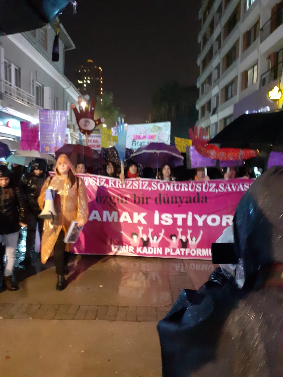 25 Kasım Kadına Yönelik Şiddete Karşı Uluslararası Mücadele Günü’nde ÖSYM önünde toplanan İzmir Kadın Platformu, şiddetli yağmur altında yürüyüşe geçti. “Dünya yerinden oynar kadınlar özgür olsa”, “Katledilen kadınlar isyanımızdır”, “Kadın cinayetleri politiktir”, “Susma sustukça sıra sana gelecek”, “Gelsin baba gelsin koca,gelsin devlet gelsin cop,inadına isyan inadına isyan inadına özgürlük”, “Tecavüzü aklama suça ortak olma”, “Susmuyoruz korkmuyoruz itaat etmiyoruz”, “Bağır herkes duysun erkek şiddeti son bulsun”, “Kadınlar savaş istemiyor”, “Jin jiyan azadî”, “Kadınlar savaş istemiyor”, “Savaşa değil, sığınağa bütçe”, “Tacize karşı ses çıkar”, “Tecavüze karşı ses çıkar”, “Militarizme karşı ses çıkar”, “Kapitalizme karşı isyan”, “Emek sömürüsüne karşı ses çıkar”, “Yaşasın kadın dayanışması” sloganları ile Türkan Saylan Kültür Merkezi önüne yürüyen kadınlar Kültür Merkezi önünde açıklama yaptı.