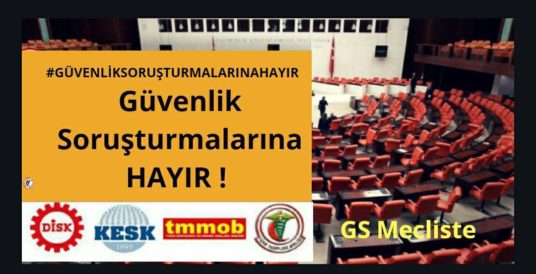 DİSK, KESK, TMMOB ve TTB olarak TBMM’de AKP iktidarınca yasalaştırılmaya çalışılan telafisi zor, mağduriyetlere yol açacak bu ayrımcı yasa tasarısına TBMM’de olumlu oy vermeyi düşünen milletvekillerini bir kez daha uyarıyoruz. Güvenlik soruşturması adı altında yasal kılıfa büründürmeye çalıştığınız insanları vatandaşlık haklarından mahrum bırakma girişimi, bu ülkeye yaptığınız kötülükler arasında ilk sıralarda yer alacak.