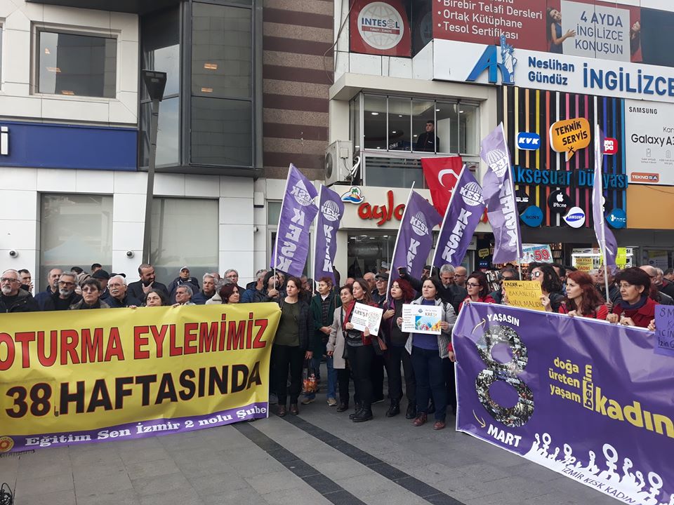 KHK eliyle bir gecede çalışma hakkından, işinden, ekmeğinden edilen kamu emekçileri Karşıyaka Çarşı girişinde 138. oturma eylemini yaptı. KHK’li kadın emekçiler, 8 Mart’a Emekçi kadınlar gününe gidilirken, kadına yönelik şiddetin , savaşın, militarizmin, gericiliğin, şiddetin, yoksulluğun, güvencesizliğin ivme kazanarak arttığı ve İstanbul’da 1-10 mart tarihleri arasında basın açıklaması ve yürüyüş, miting vb etkinliklerin yasaklandığı koşulları değiştirmek için 138.oturma eyleminde haklarını ve taleplerini haykırdılar.