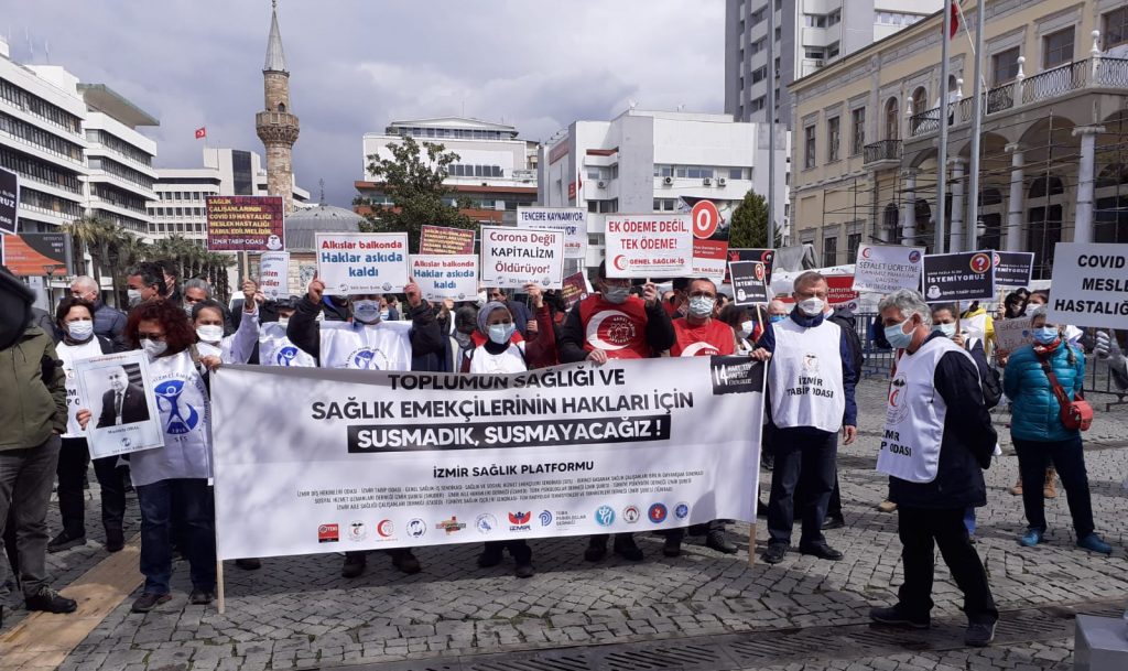 Salgının sahada karşılanmamasındaki ısrar sonucu, 2. ve 3. basamak hastanelerde hasta yoğunluğu artmış, servisler ve yoğun bakımlarda yatak sıkıntısı yaşanması üzerine boş alanlar yataklı servis veya yoğun bakımlaradöndürülmüştür.Tüm dünyada olduğu gibi ilk günden itibaren COVID-19 salgınının ilk karşılayıcıları, doğaldır ki sağlık çalışanlarıdır. Bu nedenledir ki birçok ülkede sağlık çalışanlarının toplumun diğer kesimlerine göre 4-5 kat daha fazla COVID-19 ile hastalandığı, hatta 10 kattan fazla hastalanma riski taşıdıkları saptanmıştır.Tüm yükü sağlık çalışanlarına yükleyen ve süreci yalnızca hastanelerde karşılayan strateji(sizlik), etkisizleştirilen birinci basamak sağlık sistemi ile salgını yönetmedeki beceriksizlik sonucunda onbinlerce yurttaşımızı kaybettik. Sağlık çalışanları, özverili çalışmalarına karşılık, salgının başlangıcından itibaren Sağlık Bakanlığı tarafından yeterince korunamamaları, ve yine iktidarın salgını yönetmedeki başarısızlıkları sonucunda Türkiye’de 150.000’den fazla sağlık çalışanının hastalıktan etkilendiği, şimdilik 385 sağlık çalışanının yaşamını kaybettiği bilinmektedir. Haksızlıkların, eşitsizlik ve adaletsizliğin derinleştiği bu dönemde insanlarımızı kaybederken, sağlık emekçileri yaşatma çabasını canlarıyla ödedi. Siyasal iktidar ise duyarlılığını, salgını değil algıyı yöneterek, vatandaşa kısıtlama getirirken, ‘’lebaleb’’ parti kongreleriyle gösterdi. Ağır çalışma koşulları sağlık çalışanlarında tükenmişlik sendromu yaratmıştır. Binlerce yıldır bu topraklarda şifa dağıtan sağlık çalışanları olarak önlenebilir nedenlerle yaşamını yitiren tüm meslektaşlarımızın ve yurttaşların acısını yüreğimizde hissederek bu 14 Marta çok büyük üzüntü ve öfke ile girmekteyiz.