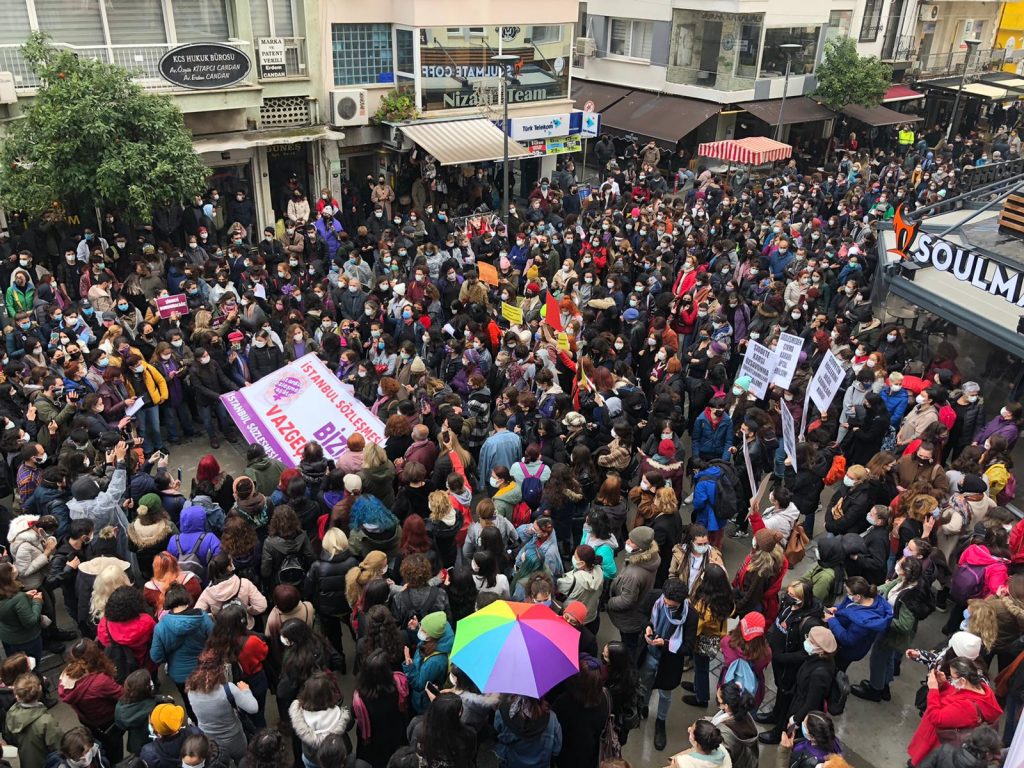 Kadına yönelik şiddetle mücadele için devlete önemli yükümlülükler getiren İstanbul Sözleşmesinin siyasi iktidar tarafından TBMM’nin iradesi yok sayılarak Cumhurbaşkanlığı kararnamesi ile hukuk dışı bir biçimde fesh edilmesi karşısında İzmir’de kadınlar sokağa çıktı. Türkan Saylan Kültür merkezi önünde toplanan kadınlar, “Sözleşmeyi nasıl kazandıysak öyle savunacağız.” , “İstanbul Sözleşmesi bizimdir, vazgeçmeyiz ” diye haykırdılar.