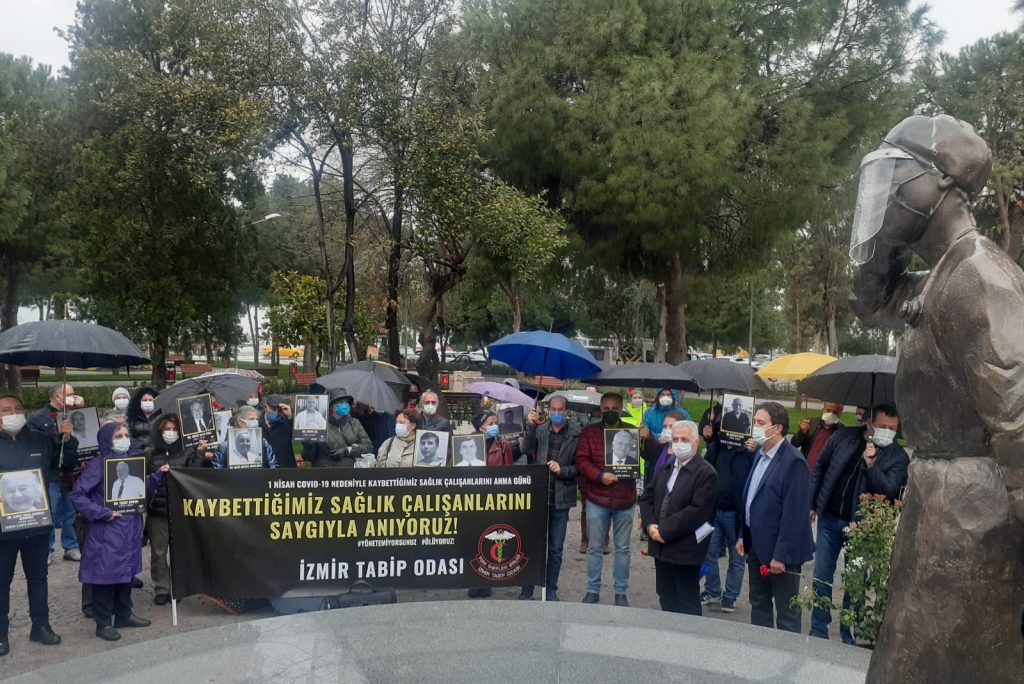 İzmir Tabip Odası, ‘1 Nisan Covid-19 Nedeniyle Kaybettiğimiz Sağlık Çalışanlarını Anma Günü’nde bütün sağlık kurumlarında ve Karşıyaka ilçesinde ‘Sağlık Çalışanlarına Saygı Anıtı’ önünde anma ve basın açıklaması düzenledi.
