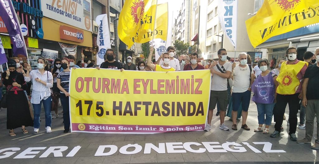 Kesk İzmir Şubeler Platformu ve İzmir Eğitim-Sen 2 No’lu Şube, Kanun Hükmünde Kararname (KHK) ile bir gecede hukuksuz haksız bir biçimde işinden olan kamu emekçilerinin işlerine geri dönebilmeleri için başlattığı mücadelenin 175 haftasında da, basın açıklaması ve oturma eylemini Karşıyaka Çarşı’da gerçekleştirdi.