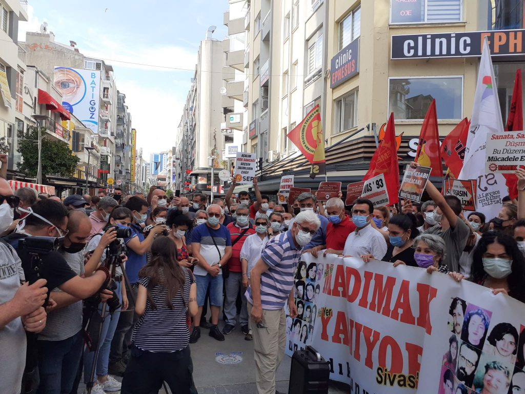 Sivas Madımak Oteli’nde 335 aydın, yazar, şair, halk ozanı ve iki otel çalışanının yakılarak katledildiği Sivas Katliamı’nın 28’inci yıl dönümünde; İzmir’de Alevi kurumlarının çağrısı ve İzmir Emek ve Demokrasi Güçleri’nin katılımıyla Alsancak Türkan Saylan Kültür Merkezi önünde bir kez daha yaşamını yitirenler saygıyla anıldı, katliam lanetlendi ve açıklama yapıldı. Açıklamaya katliamda yaşamını yitiren Metin Altıok’un kızı Zeynep Altıok da katıldı.