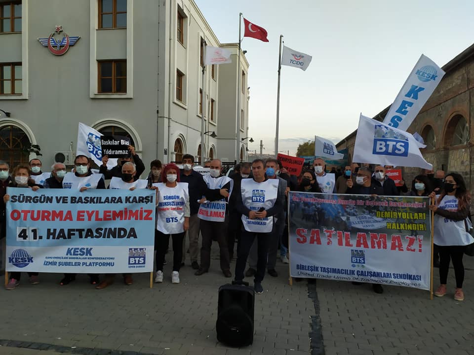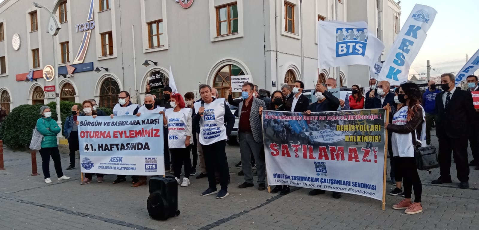 Birleşik Taşımacılık Çalışanları Sendikası (BTS) İzmir Şubesi üyeleri “Sürgün ve Baskılara Karşı Oturma Eylemimiz 41. Haftasında” ve “Demiryolları halkındır Satılamaz” pankartları arkasında toplanarak siyasi iktidarın baskı ve sürgün politikalarına ve TCDD’nın satılmasına karşı açıklama yaptı.