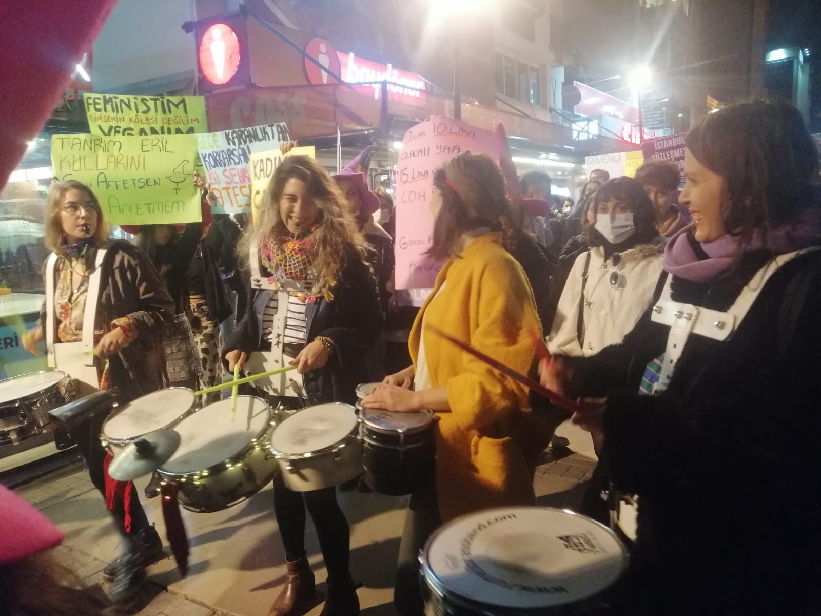 Sadece burada İzmir’de değil, Türkiye ve dünyanın dört bir yanında yan yana omuz omuzayız. Polonya’da kürtaj yasaklarına, Afganistan’da Taliban zulmüne karşı direnen kadınlarız, Danimarka’da, onay olmadan gerçekleşen cinsel ilişkinin tecavüz olduğunun yasalarda tanınmasını sağlayanlarız, her yerdeyiz. Kirpiğimiz yere düşmesin diye mücadele etmeye kararlıyız.