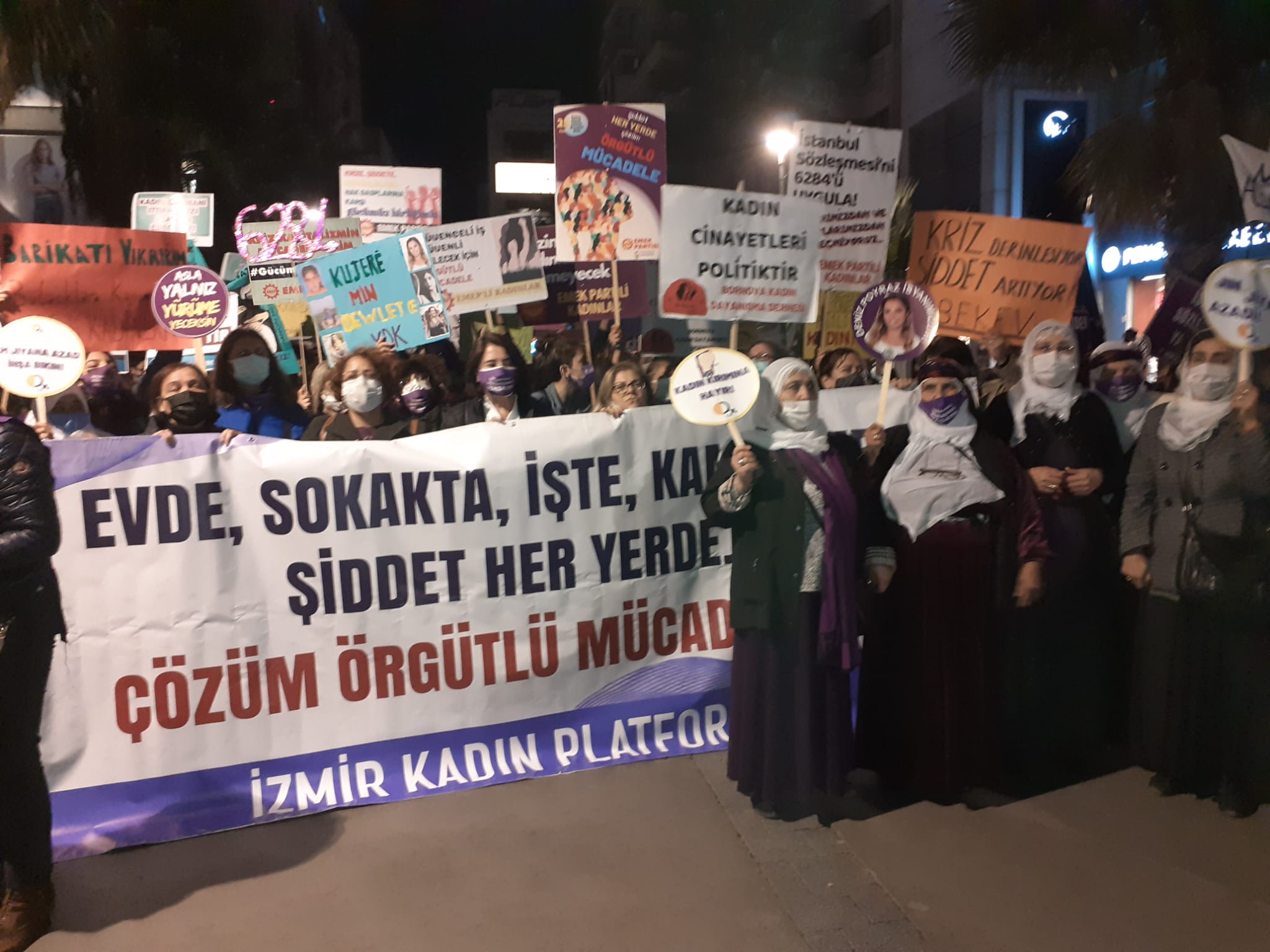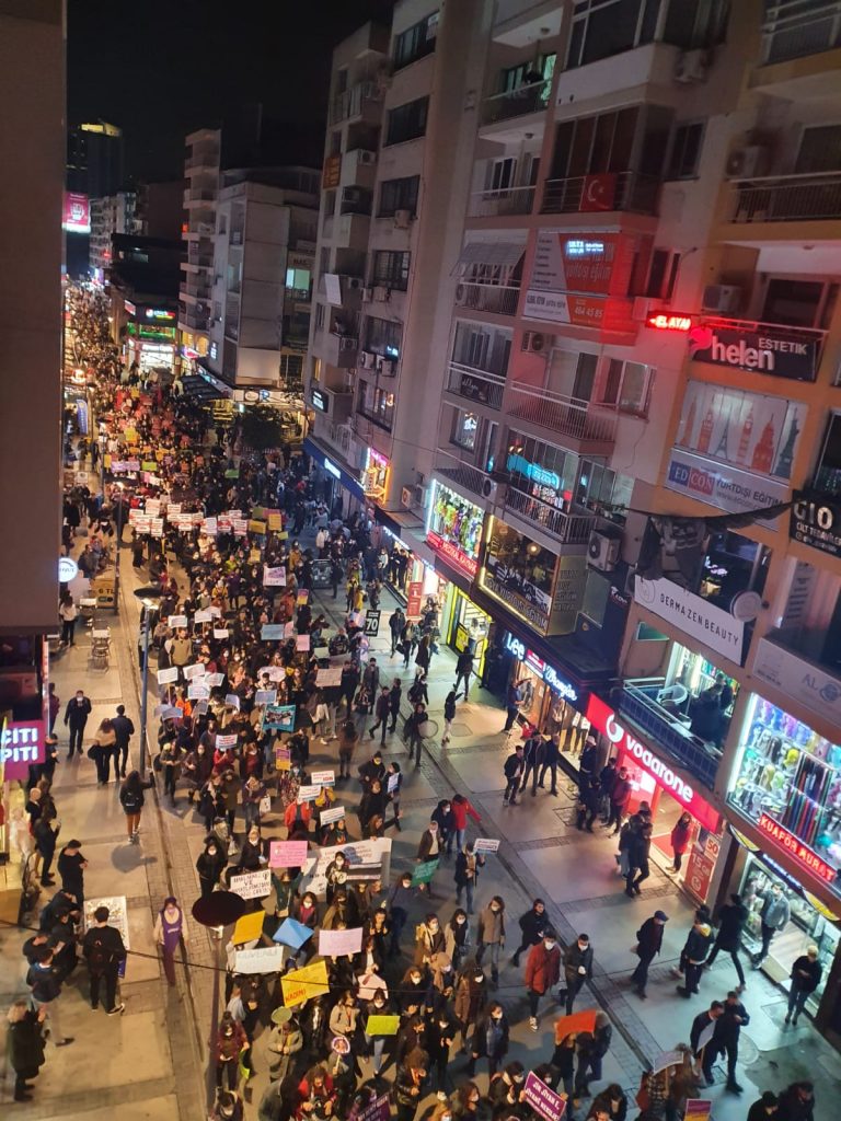 Binlerce kadın siyasi iktidarı hayat pahalılığını, şiddeti, yoksulluğu, ekonomik krizi protesto etti. Hükümeti istifaya çağırdı. Kadınlar Leman Kafe önünden Türkan Saylan Kültür Merkezi önüne kadar yürüdü. Yürüyüşe HDP İzmir Milletvekili Serpil Kemalbay Pekgözegü’de katıldı.Y ürüyüş boyunca kadınlar aşağıdaki pankartları ve sloganları hem taşıdı hem de attı.