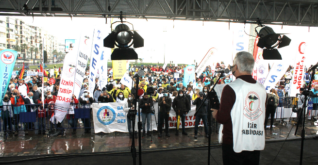 İzmir Sağlık Platformu (İzmir Tabip Odası, Aile Hekimliği Çalışanları Sendikası, Birinci Basamak Sağlık Çalışanları Birlik Dayanışma Sendikası izmir Şube, Genel Sağlık- İş Sendikası İzmir Şube, İzmir Aile Hekimleri Derneği, İzmir Aile Sağlığı Çalışanları Derneği, Sağlık ve Sosyal Hizmet Emekçileri Sendikası, İzmir şube ile Türkiye Aile Hekimliği Uzmanlık Derneği) siyasi iktidardan ‘Aile Hekimliği Sözleşme ve Ödeme Yönetmeliği’ nin geri çekilmesi talebiyle İzmir Gündoğdu Meydanı’nda miting gerçekleştirdi.