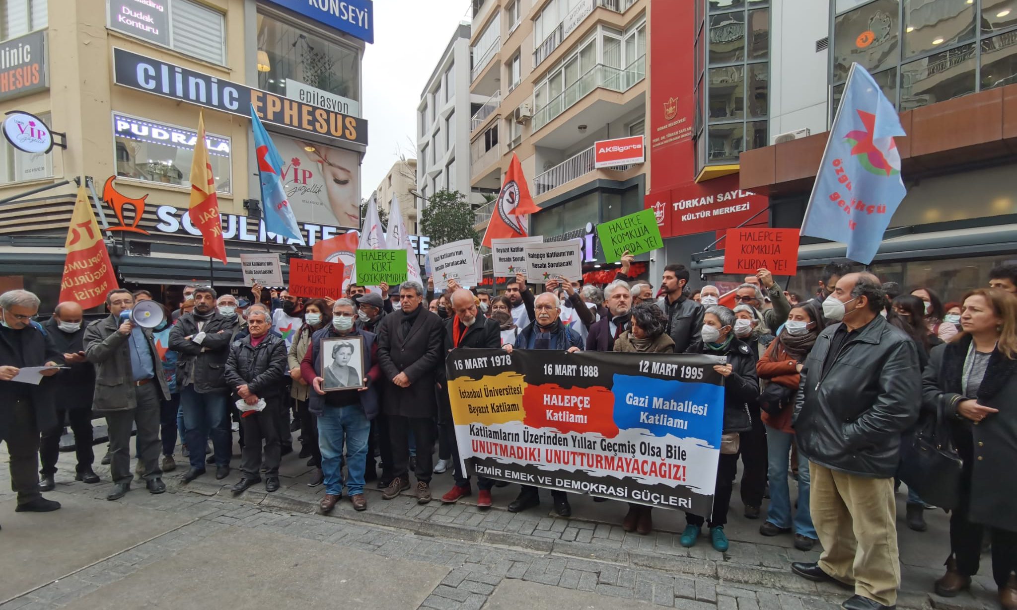 İzmir Emek ve Demokrasi Güçleri; Beyazıt, Gazi Mahallesi ve Halepçe katliamlarına ilişkin Alsancak Türkan Saylan Kültür Merkezi önünde basın açıklaması yaptı. “Katliamların üzerinden yıllar geçmiş olsa bile unutmadık, unutturmayacağız” pankartını açıldığı eylemde sık sık ” beyazıt katliamını unutmadık”, “Halepçe katliamını unutmadık”, “Gazi katliamını unutmadık” , “Savaşa hayır barış hemen şimdi”, “Gün gelecek devran dönecek katiller halka hesap verecek”, “Yaşasın hakların eşitliği” , “Yaşasın halkların kardeşliği”, “Faşizme karşı omuz omuza” sloganları atıldı.