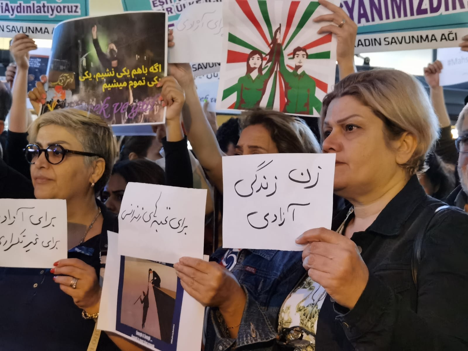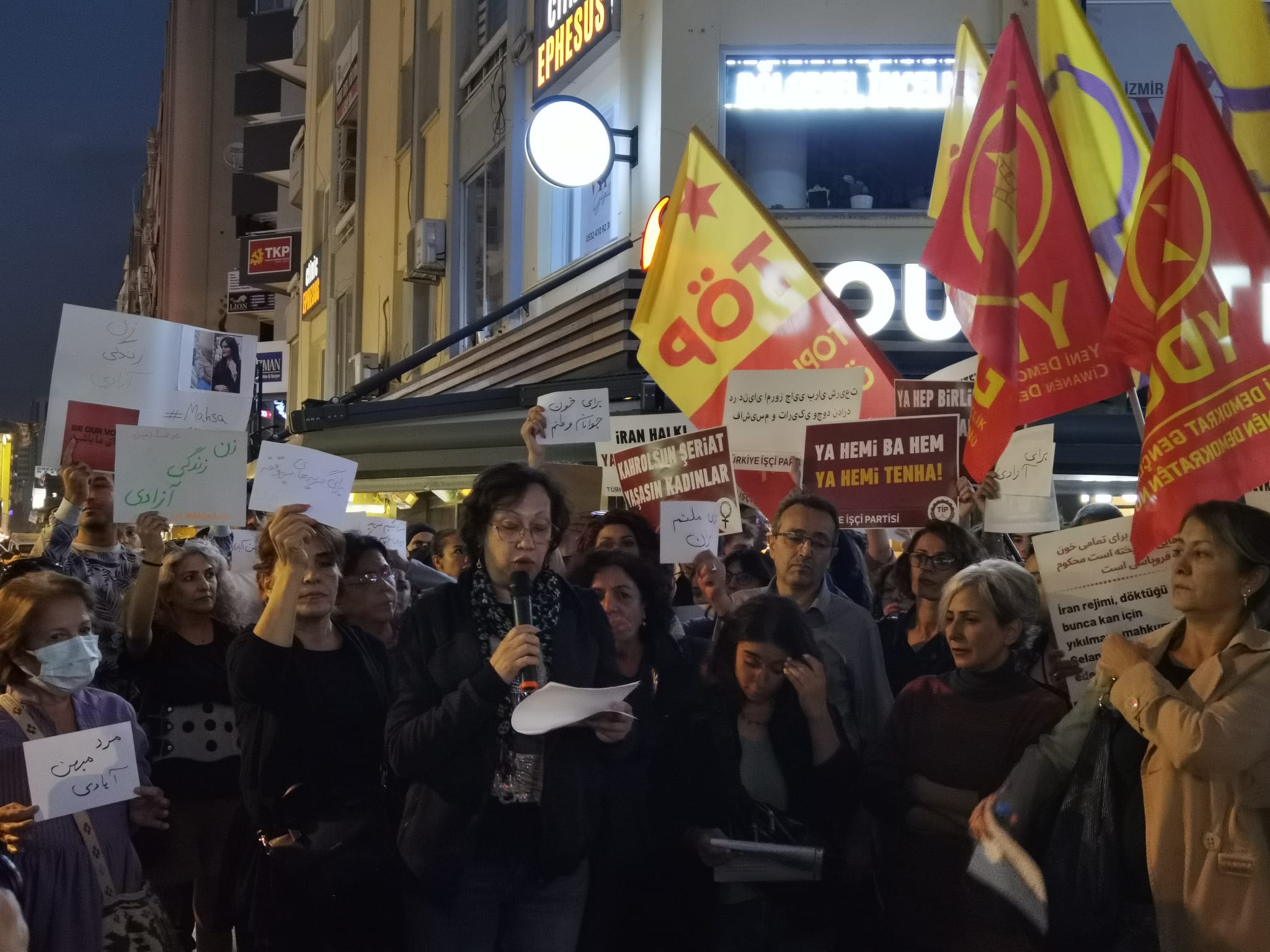 “Bugün burada 22 yaşındaki kürt kadın Mahsa Amini’nin İran ahlak polisleri tarafından işkenceyle katledilmesi ile İran halkının faşist, gerici Molla Rejimine karşı başlattığı direnişe ses vermek için toplandık.