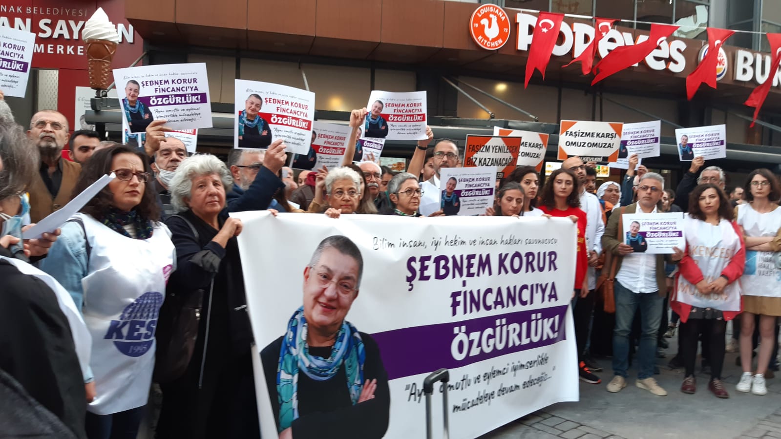İzmir’de 10 Ekim Aileleri, Ata Soyer Sağlık ve Politikaları Araştırma Derneği, Çağdaş Hukukçular Derneği İzmir Şubesi, Hak İnisiyatifi Derneği, Halkevleri, Halkların Köprüsü Derneği, İmece-Der, İnsan Hakları Derneği İzmir Şubesi, İnsan Hakları Gündemi Derneği, KESK İzmir Şubeler Platformu, Özgürlük için Hukukçular Derneği İzmir Şubesi, Sağlık ve Sosyal Hizmet Emekçileri Sendikası (SES) İzmir Şubesi, Türkiye İnsan Hakları Vakfı İzmir Temsilciliği, Türk Tabipler Birliği Başkanı ve Türkiye İnsan Hakları Vakfı Yönetim Kurulu üyesi Prof. Dr. Şebnem Korur Fincancı’nın serbest bırakılması talebiyle Türkan Saylan Kültür merkezi önünde protesto eylemi ve basın açıklaması gerçekleştirdi. “Bilim insanı, iyi hekim ve insan hakları savunucusu Şebnem Korur Fincancı’ya özgürlük, aynı umutlu ve eylemci iyimserlikle mücadeleye devam edeceğiz” pankartı açıldı. “Şebnem Korur Fincancı yalnız değildir”, “İnsan haklarıyla insandır” ve “Susmuyoruz, korkmuyoruz, itaat etmiyoruz” sloganları atıldı.