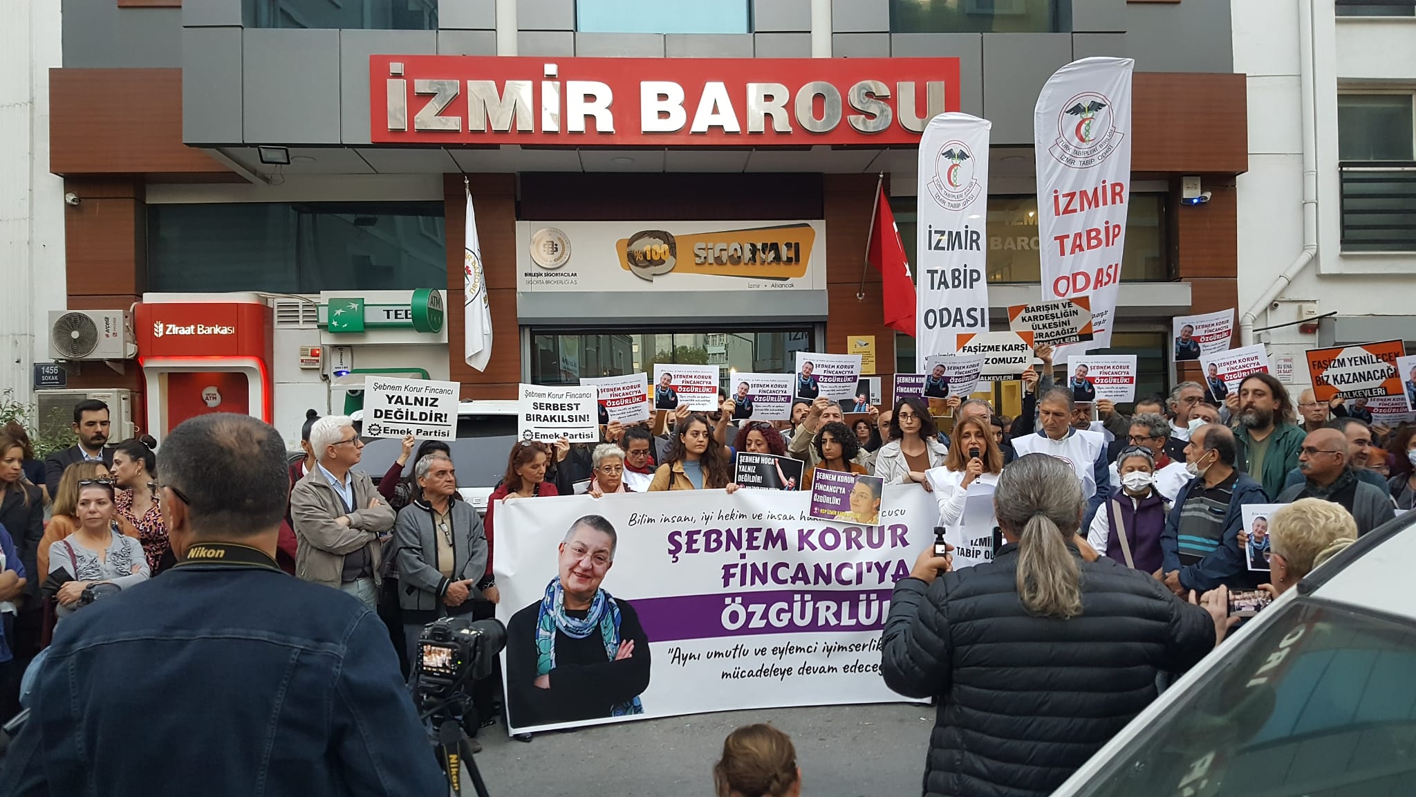 İzmir Emek ve Demokrasi Güçleri, Türk Tabipler Birliği Merkez Konseyi Başkanı Şebnem Korur Fincancı’nın tutuklanmasını protesto etti ve basın açıklaması düzenledi. İzmir Barosu önünde toplanan Emek ve Demokrasi Güçleri “Bilim insanı, iyi hekim ve insan hakları savunucusu Şebnem Korur Fincancı’ya özgürlük, aynı umutlu ve eylemci iyimserlikle mücadeleye devam edeceğiz” yazılı pankart açtı. Katılımcılar “Şebnem Korur Fincancı onurumuzdur” ve “Birleşe birleşe kazanacağız”, “Şebnem hocaya özgürlük”, ” Şebnem Korur Fincancı yalnız değildir”, “Faşizme karşı omuz omuza” sloganlarını attı.