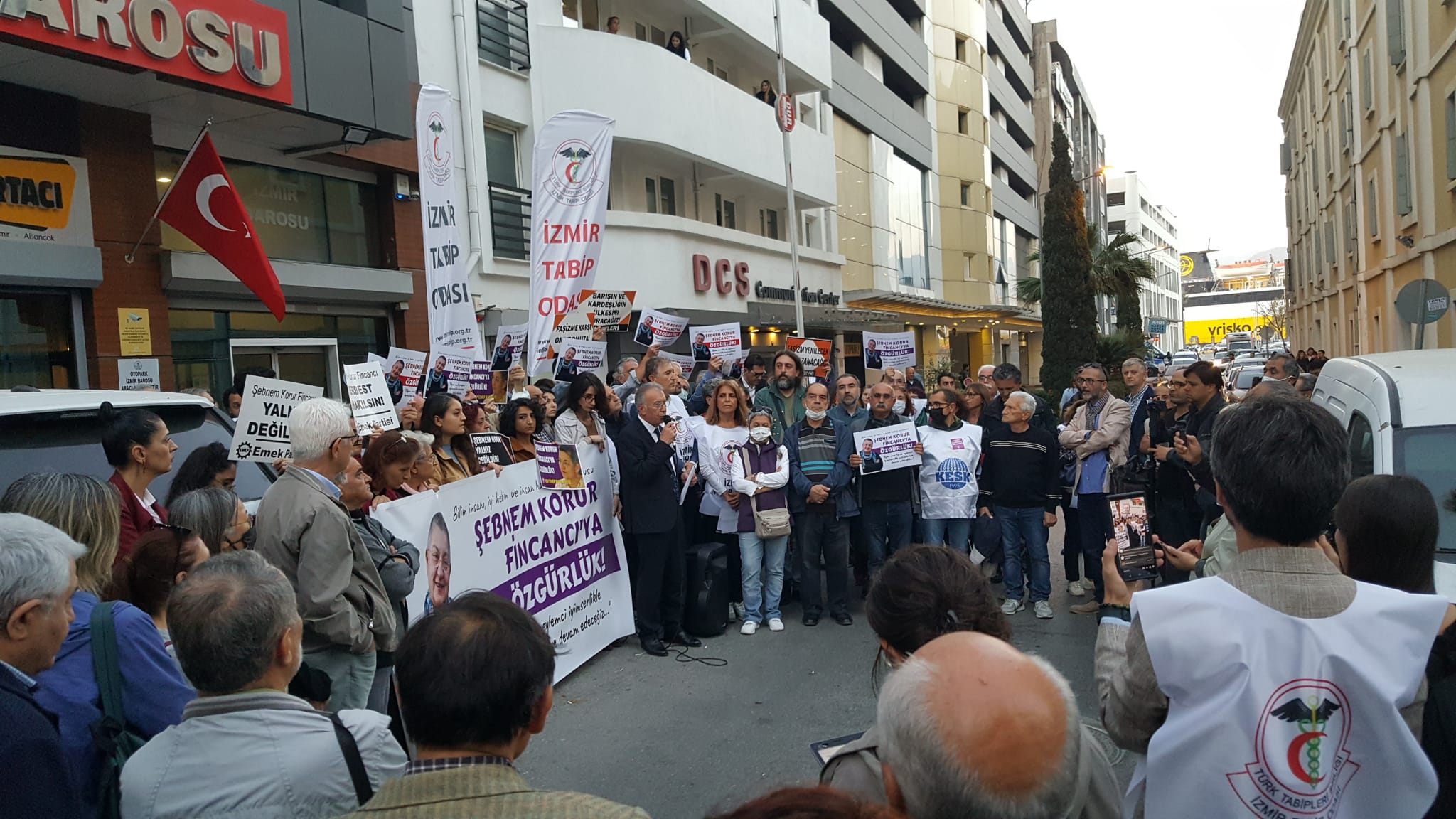 İzmir Barosu Başkanı Sefa Yılmaz, “ Şebnem Koruru Fincancı’yı tutuklamanın hukuksuz olduğunu bir kez daha yineliyoruz…Bu yakalama, gözaltı ve tutukluluk hallerinin tamamen CMK hükümlerine aykırı ve hukuka aykırı olduğunu görüyoruz. Tamamen CMK hükümlerine ve hukuka aykırı bir tutukluluktan bahsediyoruz. Bugün itibariyle tutukluluğunun yedinci günü. Bu süre itiraz süresiydi. Umarız ilgili makamlar yapılan hukuksuzluğu bir nebze giderirler ve Şebnem Korur Fincancı’yı serbest bırakırlar” dedi. Açıklamada TMMOB adına söz alan Uğur Toprak, “Biz TMMOB olarak her zaman olduğu gibi tabip odamızla, baromuzla omuz omuza faşizme karşı mücadele etmeye devam edeceğiz” dedi.