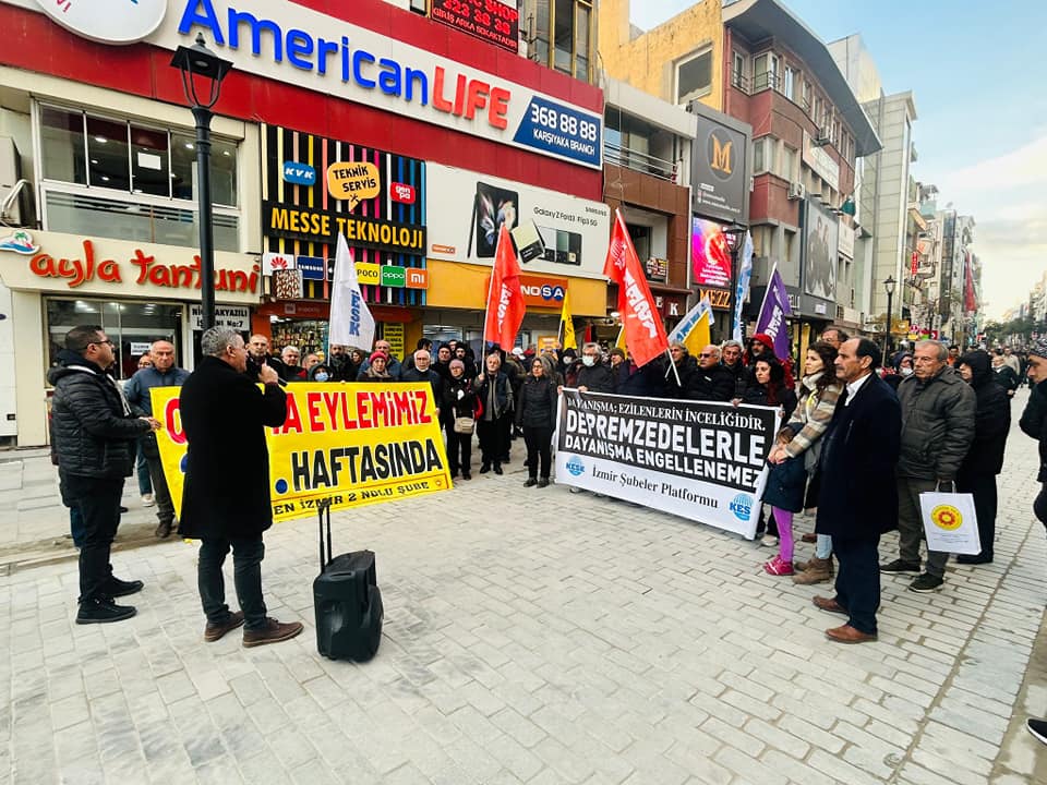 Karşıyaka çarşı girişinde KHK’li kamu emekçileri 241.hafta da oturma eylemini yaptı. Haksız, hukuksuz, ihraçlara karşı direnen kamu emekçileri ve katılımcı demokrasi güçleri depremin yıkıma yol açtığı kentlerdeki insanların sesini ve dayanışmanın gücünü dile getirdi.