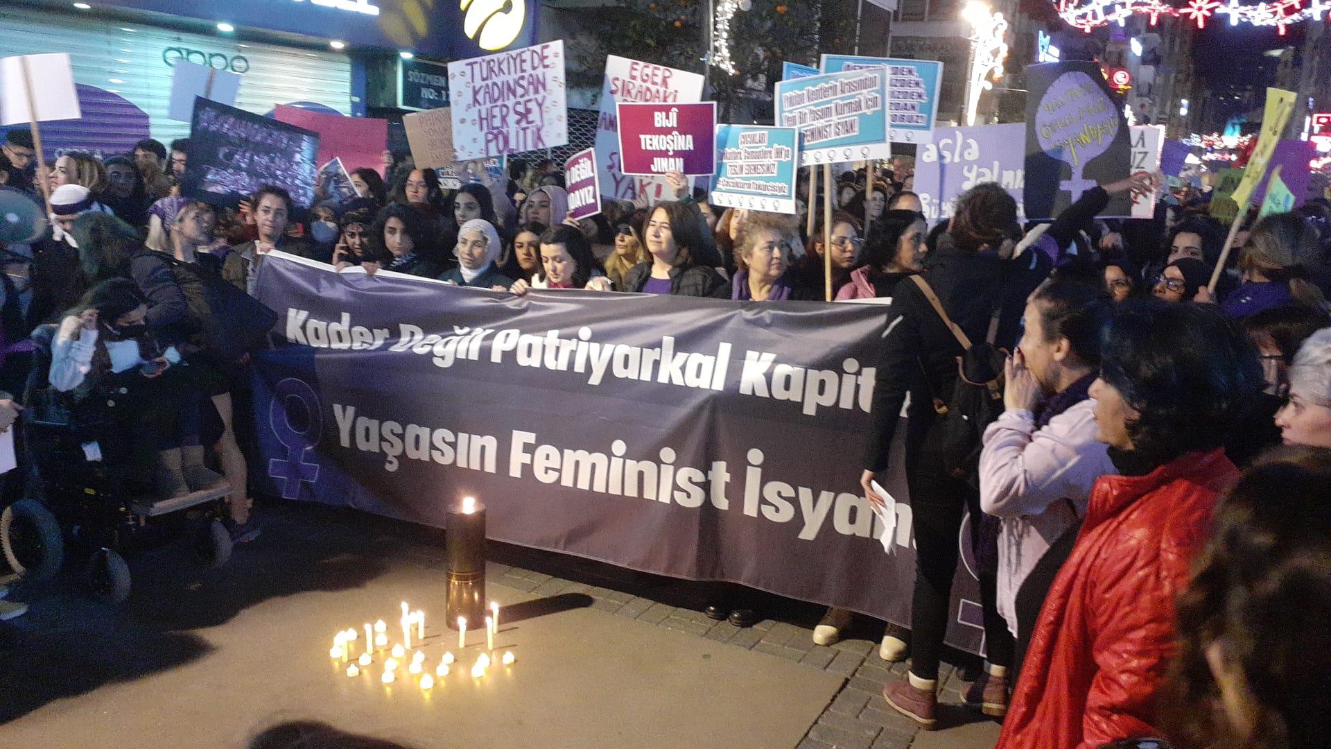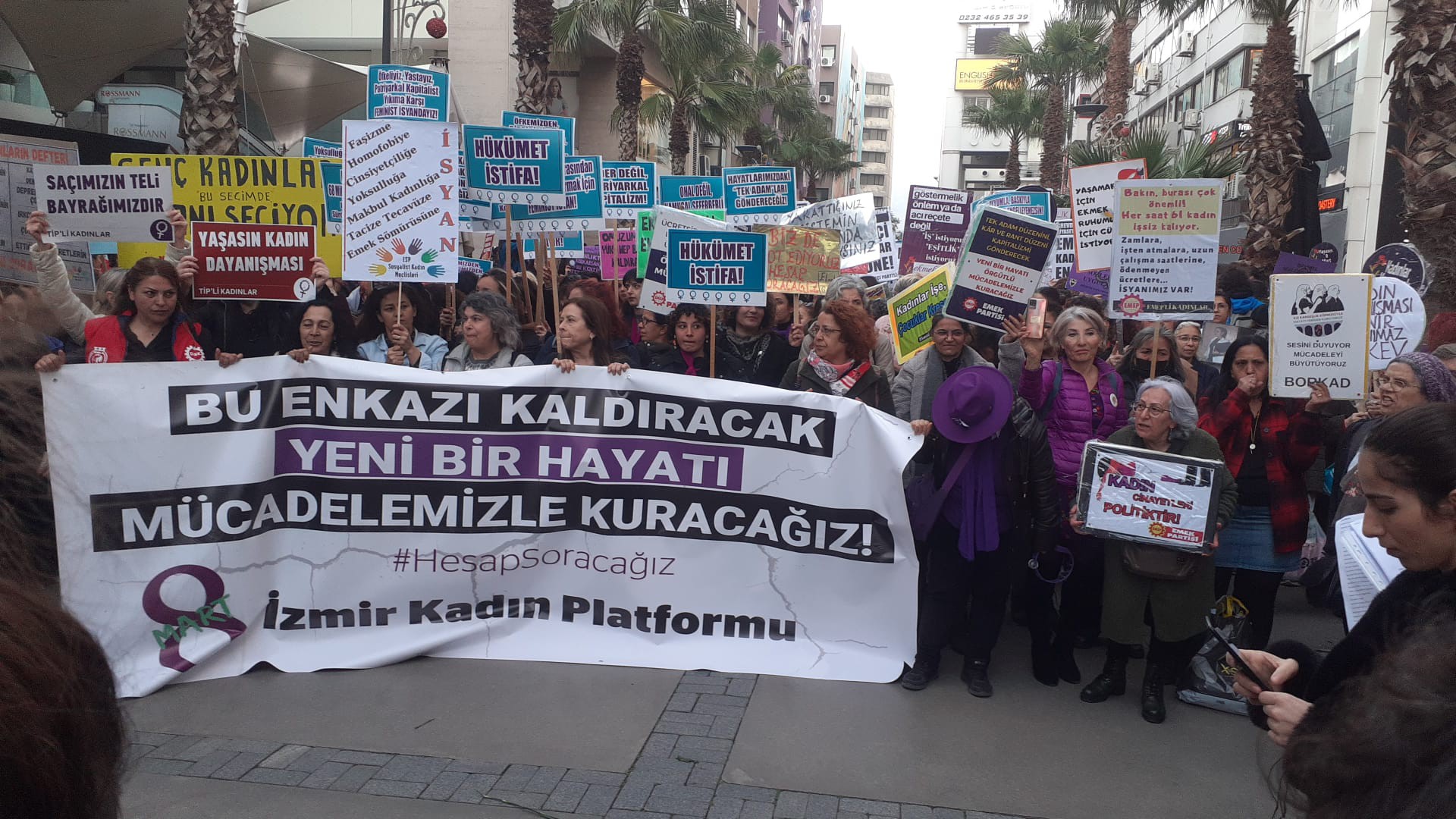 “Bu Enkazı Kaldıracak Yeni bir Hayatı Mücadelemizle Kuracağız” pankartı arkasında Alsancak Kıbrıs Şehitleri Caddesi Eski Leman Kafe önünde toplanan Ízmirli kadınlar Alsancak Türkan Saylan Kültür Merkezi Önüne yürüdü.Aciklama yapıldı. Feminist gece yuruyusu de Leman Kafe onunden basladi. Kadınlar ” Kader değil patriyarkal kapitalizm Yaşasin Feminist isyan” pankartı açarak Türkan Saylan Kültür Merkezi Önune yürüdüler. Kadınlar yürüyüşler boyunca “Yaşasın 8 Mart”,”Ya hep beraber ya hiç birimiz”, “Asla yalnız yürūmeyeceksin”, “Susmuyoruz korkmuyoruz itaat etmiyoruz”, “Kadınlar yürūyor mücadele sürüyor”, “Jín Jiyan azaldı”, “Kadın yaşam òzgūrluk”, “Kadınlar soracak AKP den hesabı”, “Geceler bizim sokaklar bizim”, “Hükümet istifa”, “Katillere hesabı kadınlar soracak”, “Yaşasın kadin dayanismasi”, “Yasasin orgutlu mücadelemiz”, “deprem degil, Devlet öldürür”, “Dünya yerinden oynar kadinlar ozgur olsa”, “Kadınlar adına Türkan Saylan Kültür Merkezi önünde açıklama yapıldı.