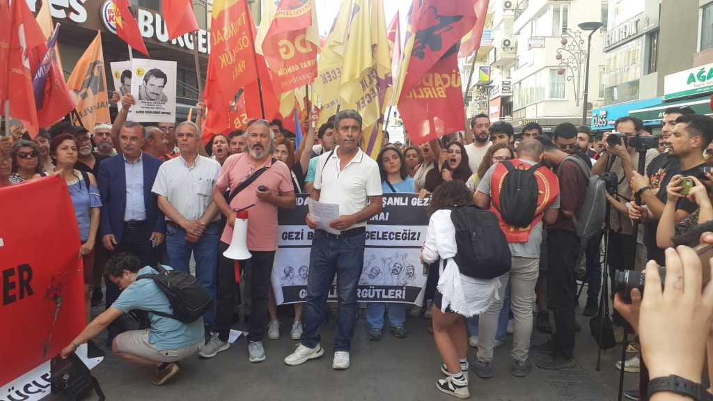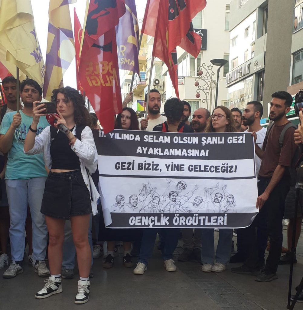 Gezi Direnişi’ nin 11. yılında İzmir Emek ve Demokrasi Güçleri, Alsancak Türkan Saylan Kültür Merkezi önünde açıklama yaptı. İzmir Barosu Başkanı Sefa Yılmaz, İzmir Tabip Odası Yönetiminden Seha Yüksel, Lütfi Çamlı, Disk’i Temsilen Lastik-İş izmir Şubesi yöneticilerinden, Zettin Yumli’ nin yanı sıra Karabağlar Belediye Başkanı Helil Kınay, DEM Parti İzmir Milletvekili İbrahim Akın , CHP İzmir eski Milletvekili Musa Çam da katıldı. Açıklamayı KESK Dönem Sözcüsü Nihat Filiz okudu. Açıklama sonrası Gençlik Örgütleri adına açıklama yapıldı . Metni Yusuf Metin okudu. Gezi direnişinin değerleriniN ve mücadelesinin önemine değindi. Tüm gençliği özgürlük mücadelesine çağırdı.