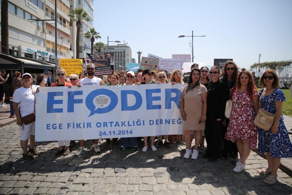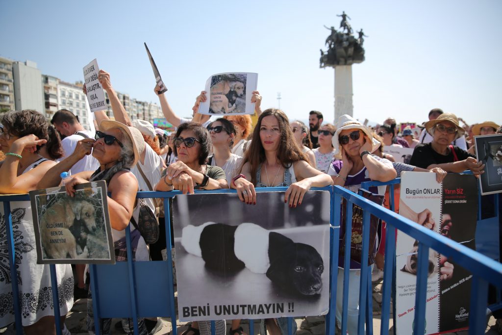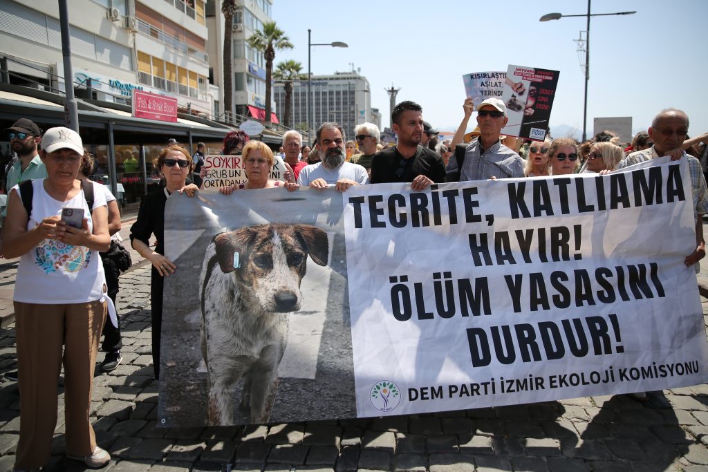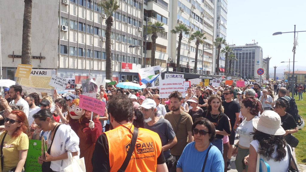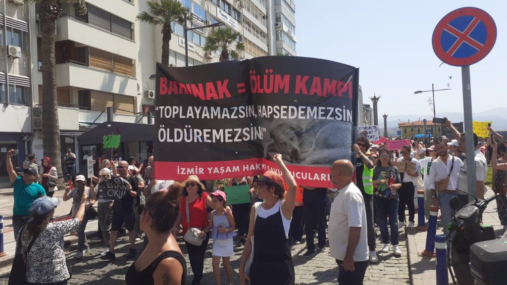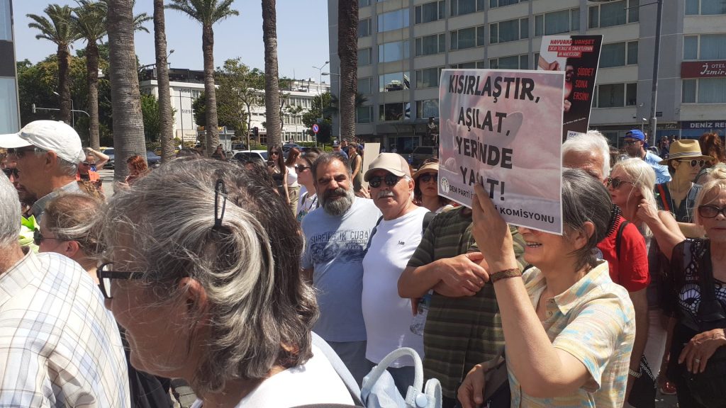 İzmir Yaşam Hakları Savunucuları ve örgütleri AKP’nin sokak köpeklerini barınaklara toplamayı ve 30 gün içerisinde sahiplenilmeyen köpekleri “uyutma”yı içeren yasa tasarısına karşı yürüyüş ve miting düzenledi.