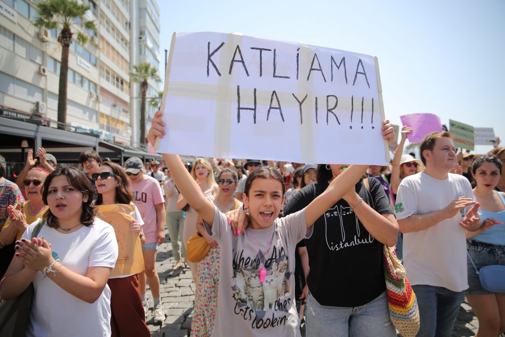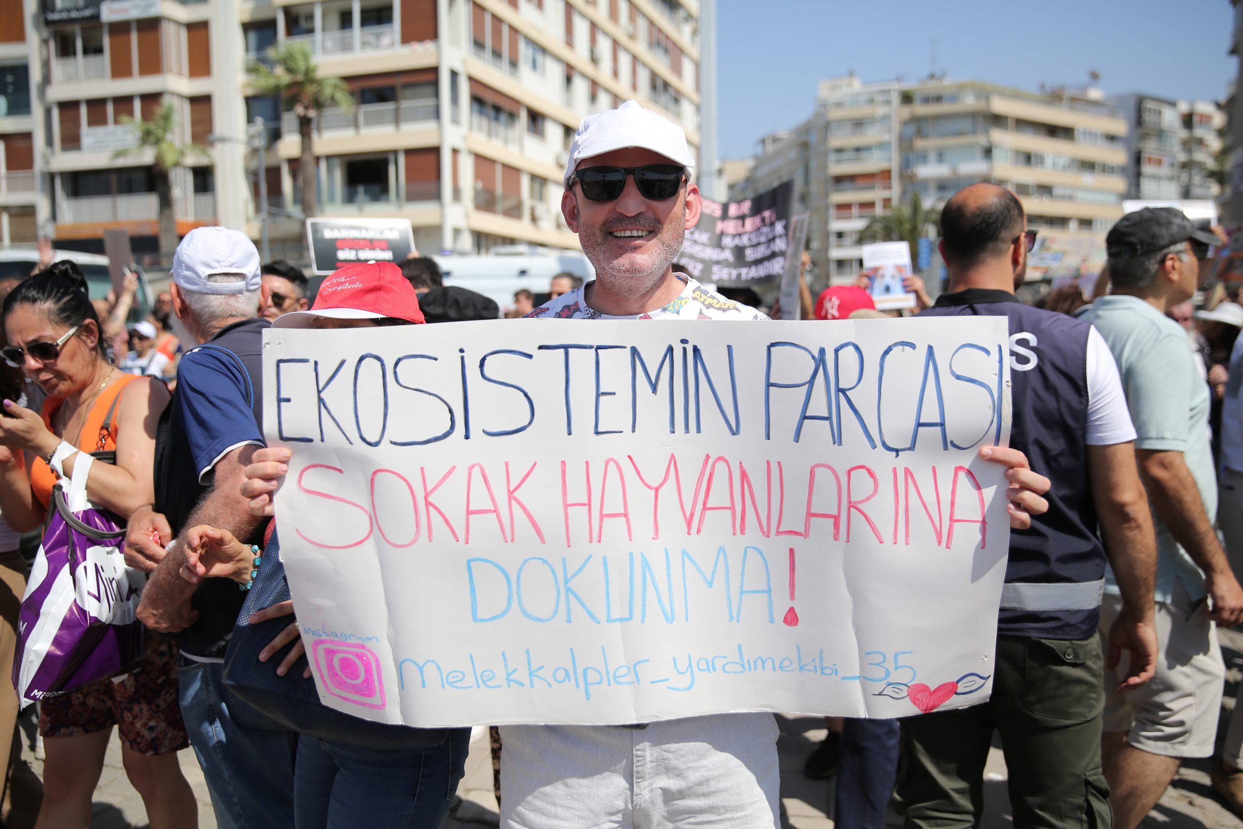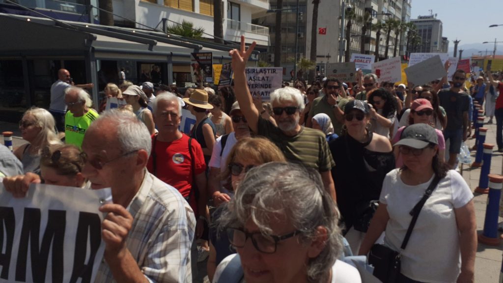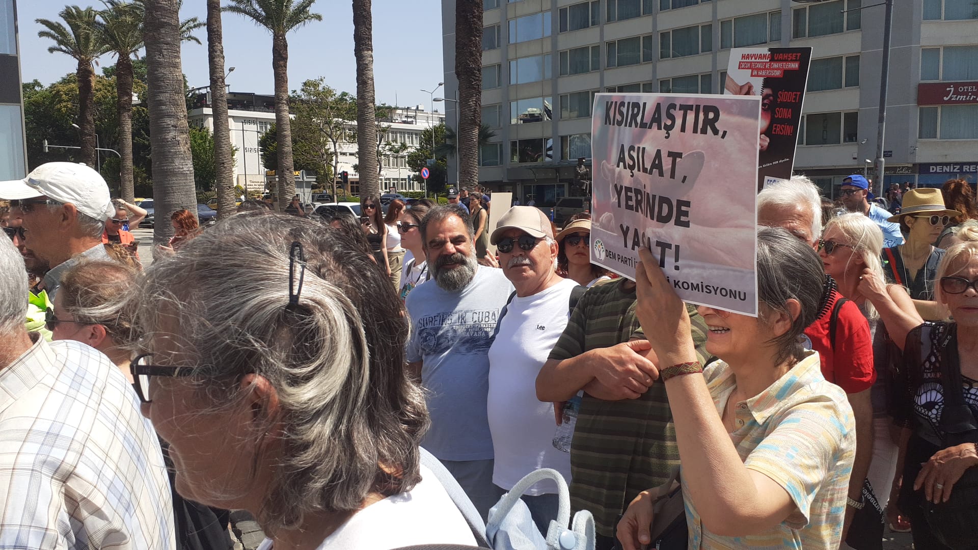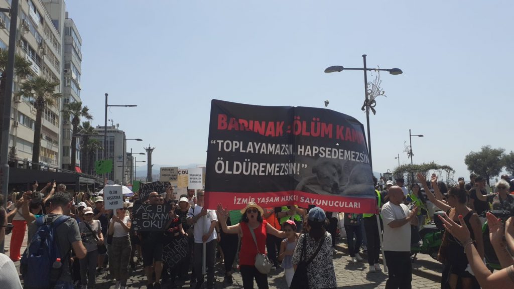 Tüm canlıların yaşam haklarını savunanlar Cumhuriyet Meydanı’nda toplanarak Gündoğdu Meydanı’na doğru yürüdü. İzmir Barosu, İzmir Tabip Odası, Türk Tabipler Birliği, TMMOB İl Koordinasyon Kurulu, Şehir Plancıları Odası, Mülkiyeliler Birliği İzmir Şubesi, Ege kent Konseyleri Birliği ve İmece-Der, DEM Parti Ekoloji Komisyonu, Ege Fikir Ortaklığı Derneği, Praksis Müzik Grubu, hayvan hakları grupları, dernekleri ve binlerce kişinin katıldığı yürüyüşte yaşam hakları savunucuları, “Katliam yasası çıkarılamaz” ” Sokaktayım yanındayım”, “Katliama karşıyım”, “Kısırlaştır aşılat yerinde yaşat”, “Medya etik ol tetikçi olma”, “Kan kokuyor kan kokuyor barınaklarınız kan kokuyor”, “Toplayamazsın hapsedemezsin öldüremezsin” , ” Kurtuluş yok tek başına ya hep beraber ya hiçbirimiz”, “Hayvan cinayetleri politiktir.” “Faşizme karşı omuz omuza”, “Susma sustukça sıra sana gelecek” sloganlarıyla tepkilerini dile getirdi.