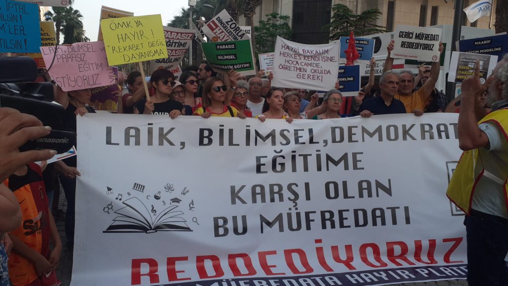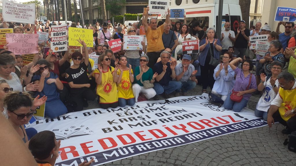 İzmir Müfredata Hayır Platformu, “Laik, bilimsel, demokratik eğitime karşı olan bu müfredatı reddediyoruz” pankartını açarak, Konak Metro İstasyonu çıkışında toplandı eski Sümerbank önüne yürüdü. Konak eski Sümerbank önünde oturma eylemi yaptı. AKP-MHP faşizminin dini esaslara dayalı toplum modelini temel alan, laiklik ve bilim karşıtı yeni müfredatına karşı alanlara çıkan eğitim ve bilim emekçileri, öğrenciler, veliler, kitle örgütleri ve siyasi parti temsilcileri bilimi ve laik eğitimi savunan kitle ” Gerici Müfredat Geri Çekilsin”, “Karanlığa Teslim Olmayacağız”, “Laik, Bilimsel, Anadilde Eğitim”, “Laik, Bilimsel Demokratik Eğitim”, “Gerici Eğitim İstemiyoruz”, “Vur Vur İnlesin Yusuf Tekin Dinlesin”, “Susma Sustukça Sıra Sana Gelecek”, “Gün Gelecek Devran Dönecek AKP Halka Hesap Verecek”, “Biz Çocuklarımıza Onurlu Bir Gelecek Bırakacağız Ya Siz” “Susma Sustukça Sıra Sana Gelecek”, “Gerici Müfredat İstemiyoruz”, “Parasız, Bilimsel, Anadilde Eğitim”, “Okulda İmam İstemiyoruz” “Susma haykır müfredata hayır” sloganlarını attı.