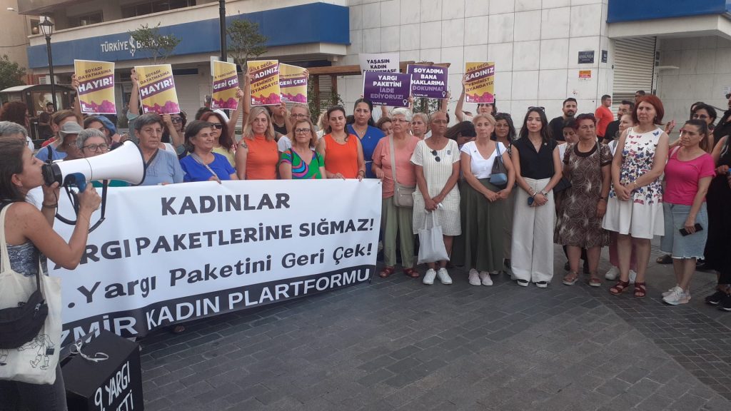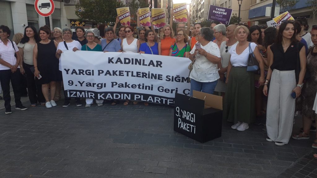 Yeni bir saldırı ise 9. Yargı Paketi. Erkek egemen devletin tüm kurumları; kadın düşmanı söylem ve politikaları hayata geçirerek, kadına yönelik her türlü şiddet faili olan erkeklere ceza indirimleri uygulayarak, kadınları koruyan yasalara saldırarak, İstanbul Sözleşmesi’nden çekilmenin ardından 6284 sayılı kanunu hedef alarak, kadınların her türlü şiddete maruz kaldığı aile kurumunu kutsallaştırarak kadına yönelik taciz, tecavüz, şiddet ve cinayetleri dolaylı olarak destekliyor.